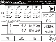 本装置は多検体のBOD測定を迅速かつ効率的に測定する装置です。 手分析の場合、希釈したサンプルを1本ずつ測定し、転記、計算を行いますが、 本装置では4本毎、連続で測定を行います。 また測定したデータは装置に自動的に保存され、パソコンの専用帳票にて演算まで行います。 測定からデータ処理まで人為的なミスを排除し測定を行う事ができます。