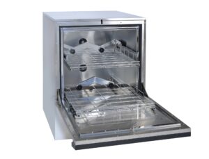 本装置は分析室向けの小型洗浄機です。洗浄動作フローとしましては、「 前洗浄 ⇒ 洗剤洗浄 ⇒ すすぎ⇒ 純水洗浄」の順で動作を行います。ガラス器具やポリ容器を洗浄機へセット後は、一連の洗浄工程を自動で行いますので、作業負担軽減やその他業務を集中して行うことが可能です。