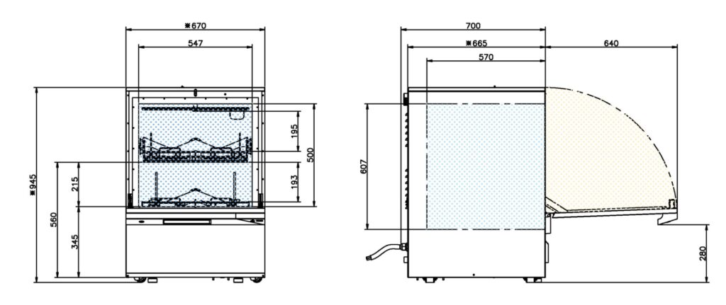| 寸法 | W670mm×D665mm×H945mm(必要設置面のみ)※扉付設置台が標準付属 |