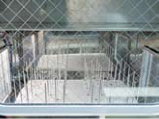 また、フラン瓶の外側にも洗浄ノズルを配置し、フラン瓶の外側・カセットも洗浄します。洗浄後は温風にて除水し、元の位置に戻します。