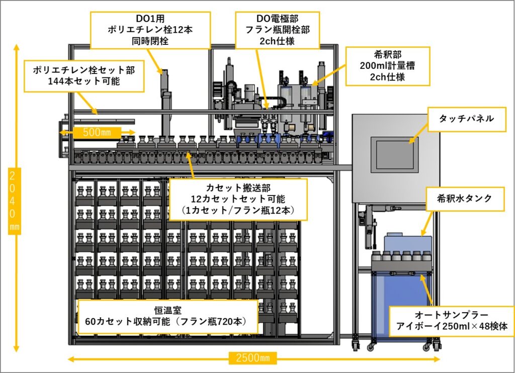 試料の前処理等の事前準備を実施後、設定倍率での試料希釈、DO1測定(培養前)、フラン瓶の閉栓、恒温室への収納、5日間の培養、恒温室からの取り出し、フラン瓶の開栓、DO5測定(培養後)まで完全自動で行います。