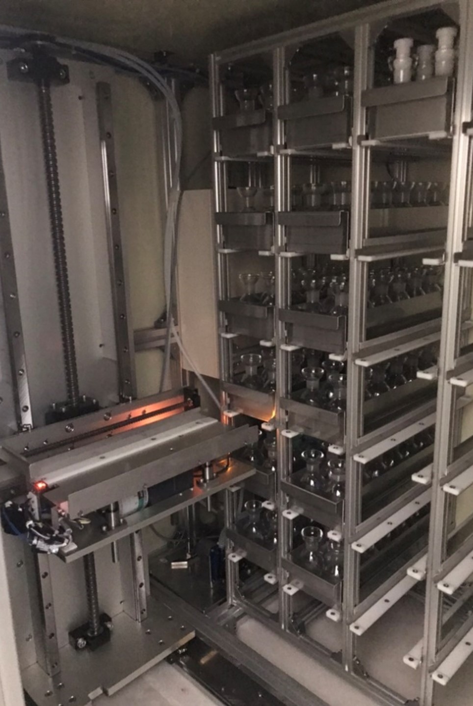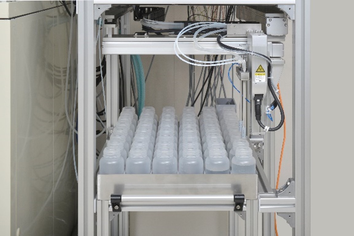 装置の下半分が恒温室となっており、精密空調機で20±1℃に維持でき、フラン瓶を720本収納可能です。これは、2段希釈では360検体分にあたり、週5日仕込む場合で、1日平均72検体処理可能です。 また、3段希釈では240検体分にあたり、週5日仕込む場合で、1日平均48検体処理可能です。